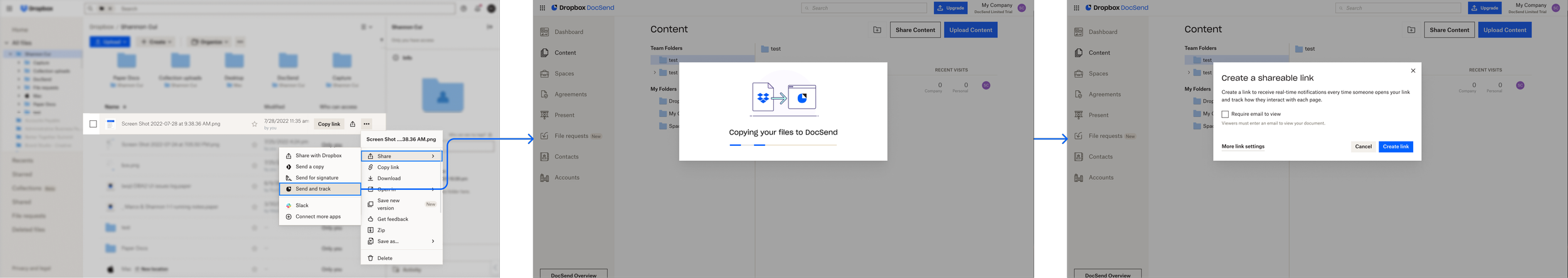 There are several entry points to guide users from Dropbox core FSS onto the DocSend standalone surface. The goal is to create a synergetic experience between Dropbox and DocSend, so that users can easily share files stored on Dropbox using DocSend’s unique secure controls and receiving analytics.