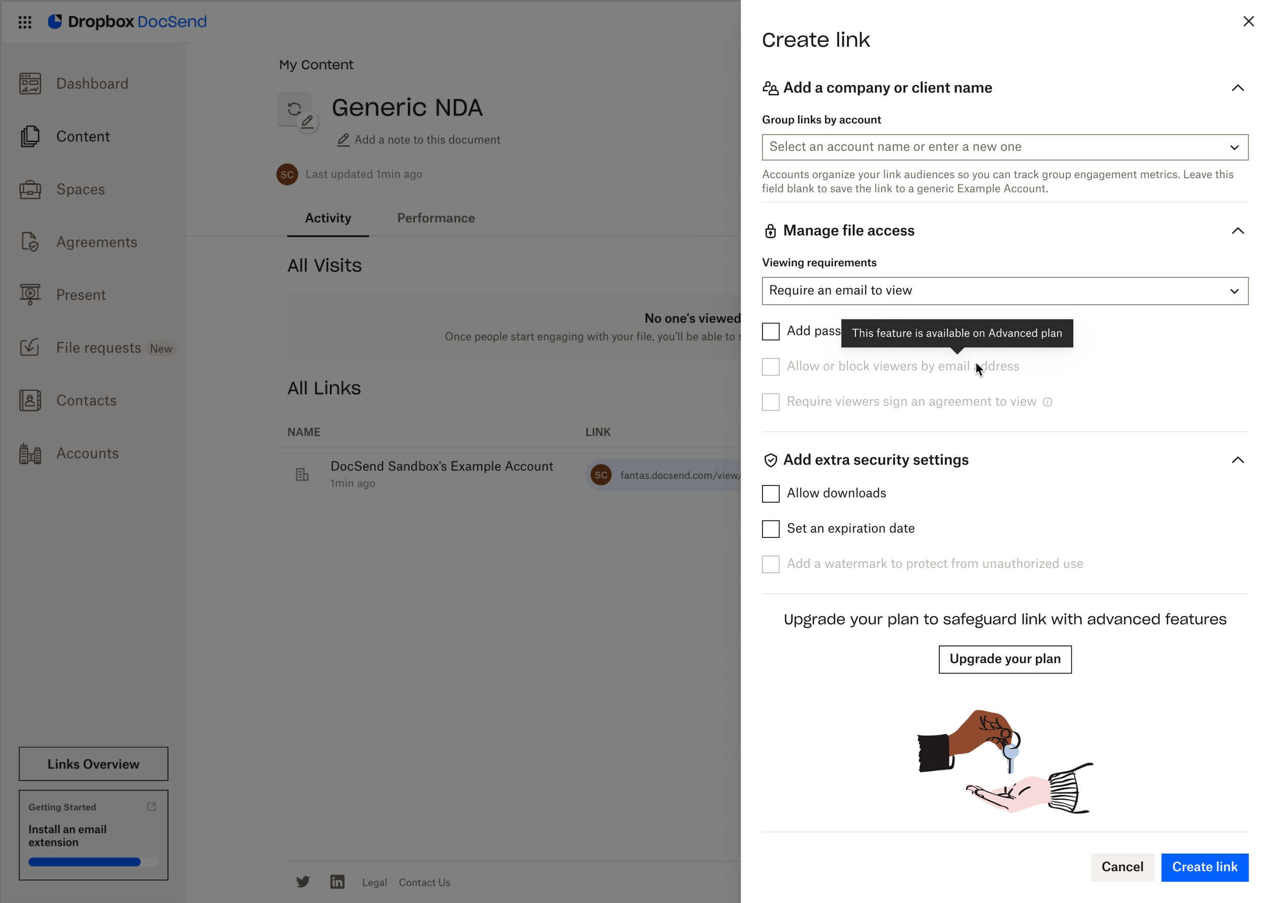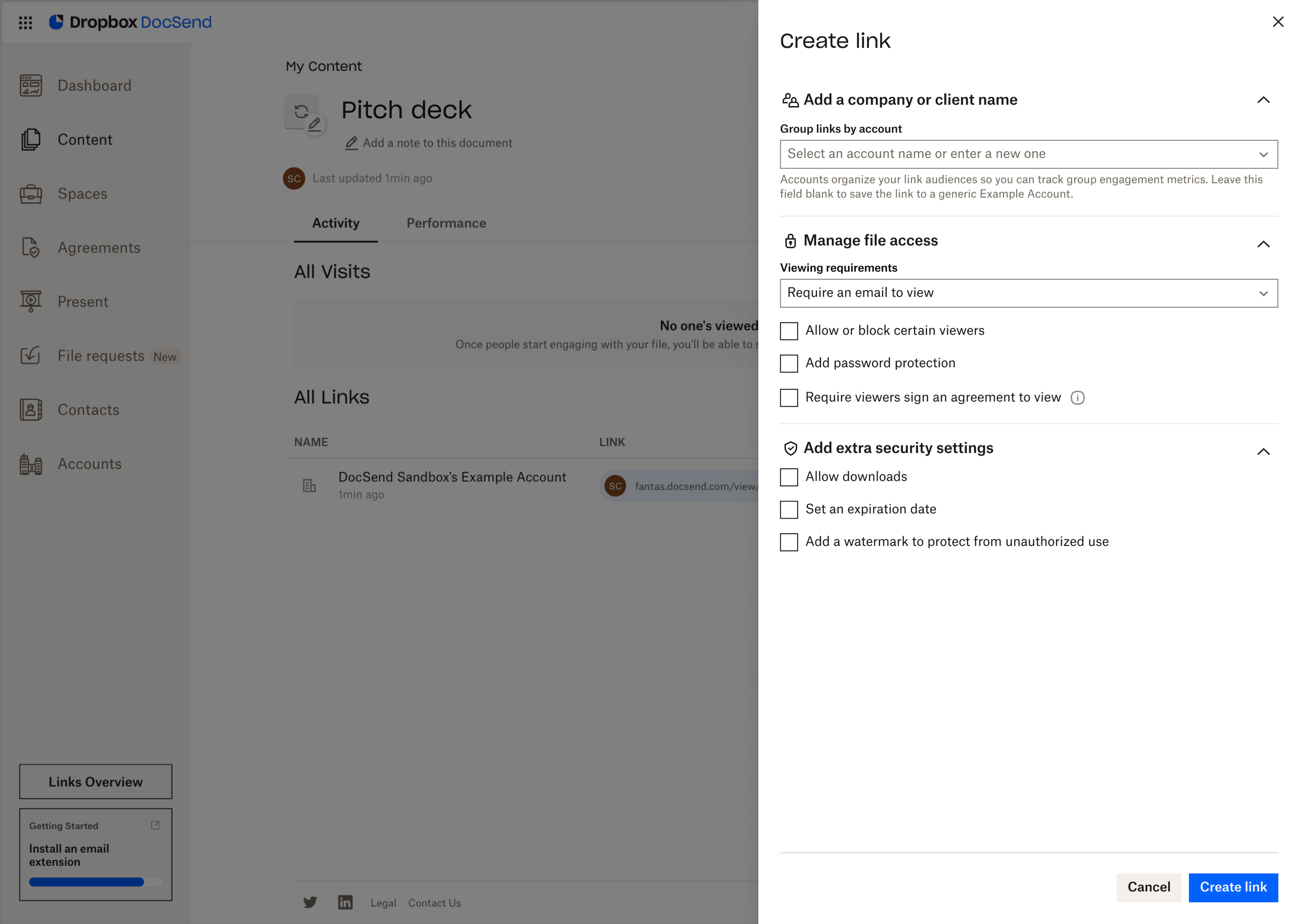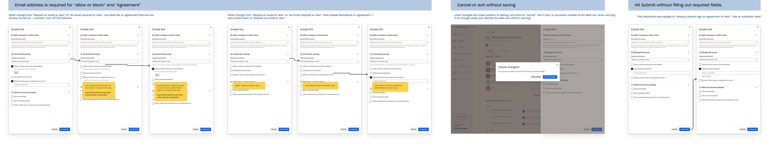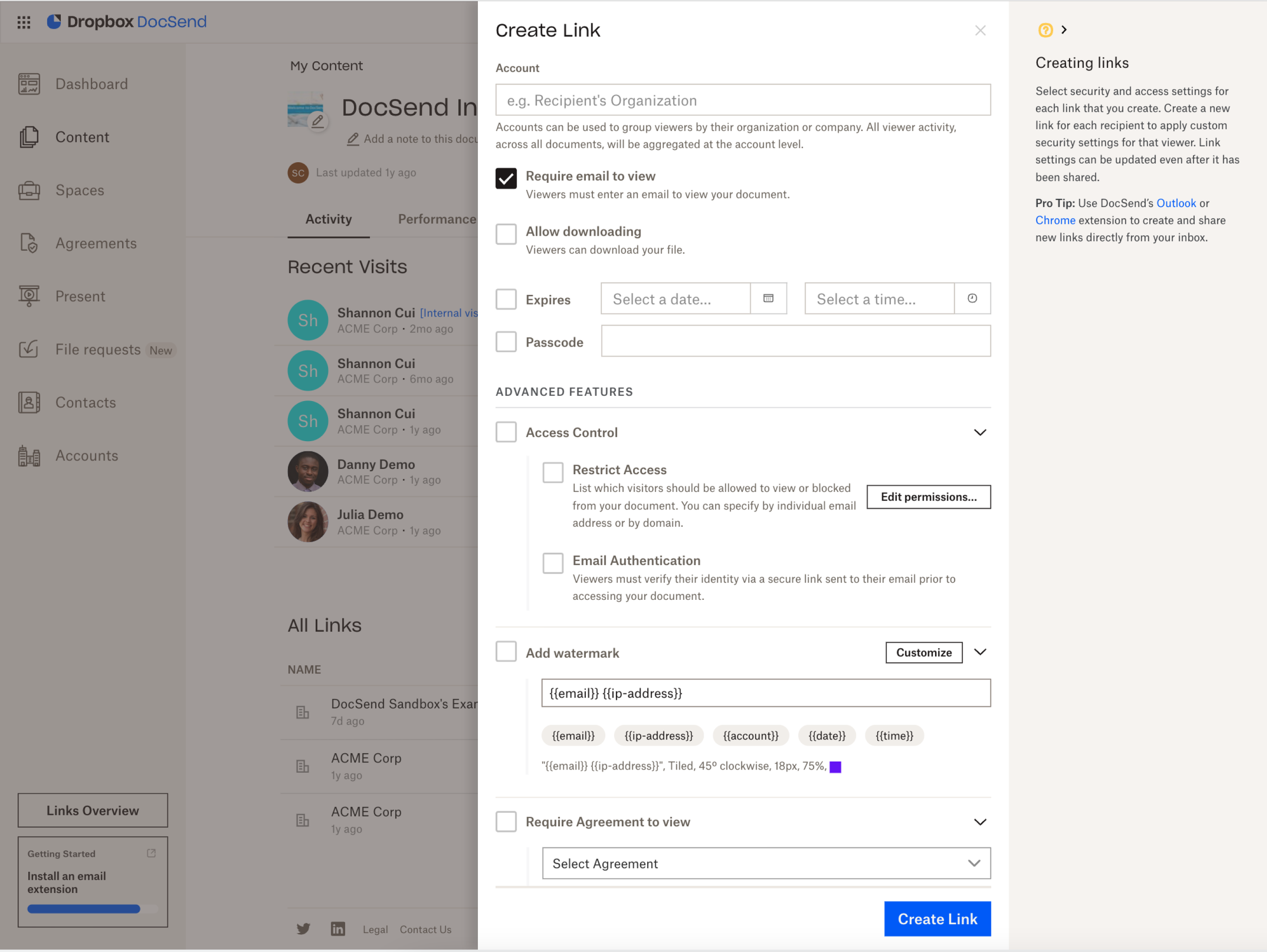 The current link creation flow is powerful but very overwhelming and lacks a clear hierarchy. The advanced security settings are not intuitive to use (eg, Accounts, Watermark...).