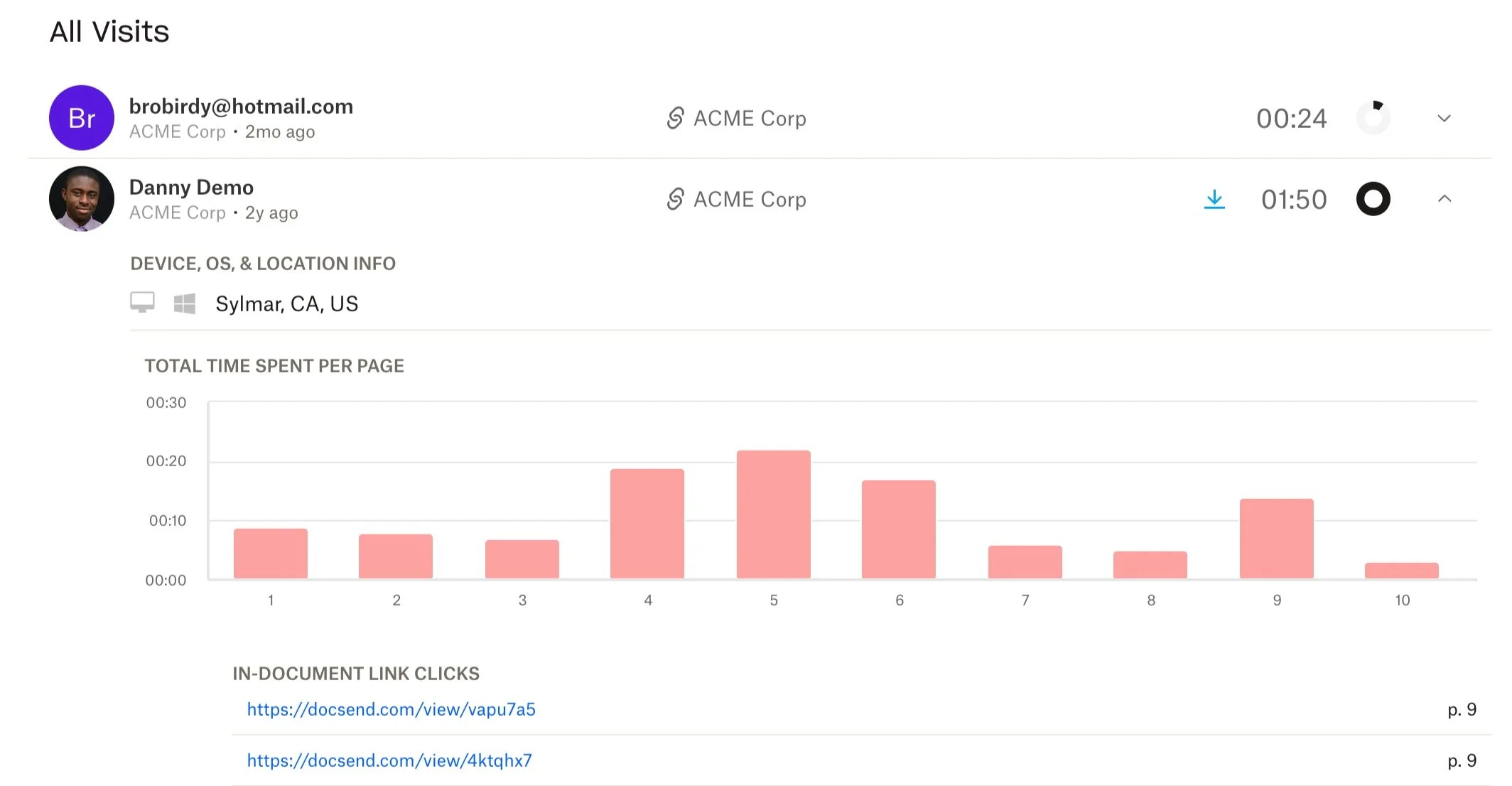 The “a-ha” moment, which is another key value proposition, is when users receive the first visit to the link and see the analytics on how the visitor is engaging with the file that they shared.