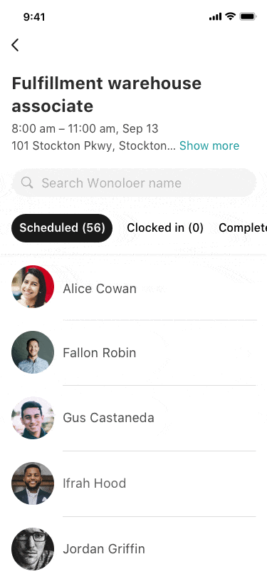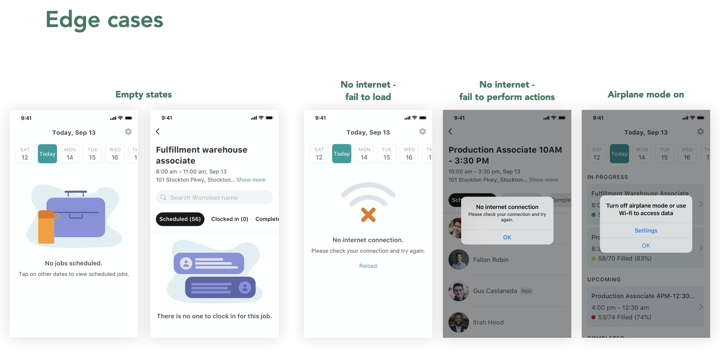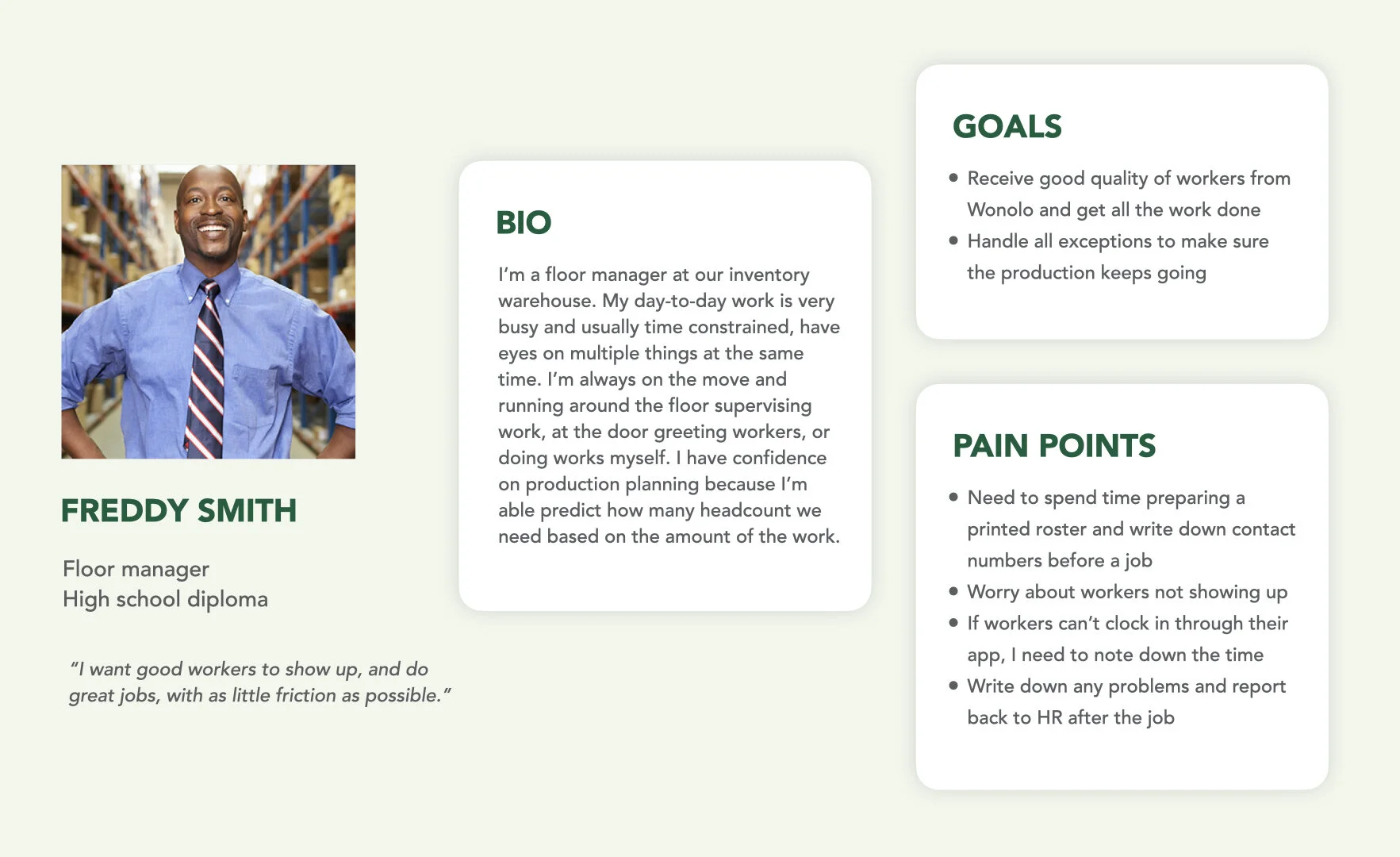 As I talked to more internal stakeholders, I realized that among Wonolo’s customers, the HR and operation managers are the ones who sit in an office and use the web portal. The floor managers, who are in direct contact with the workers in a warehouse or distribution center during a job, have no way of tracking and handling day-to-day tasks on the go through mobile. They have to manually perform those tasks or duplicate the efforts by asking the HR managers.